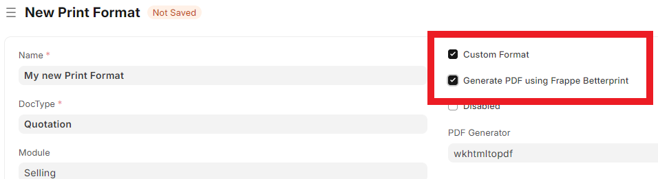 Create a new Print Format and Check "Custom Format". This will reveal a new Checkbox, "Generate PDF using Frappe Betterprint".